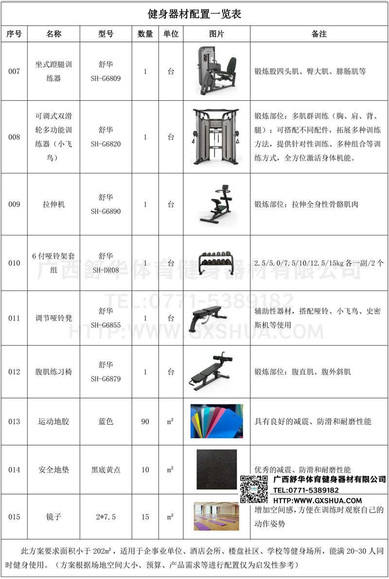 此方案要求面积小于100m²,适用于企事业单位、酒店会所、楼盘社区、学校等健身场所,能满15-20人同时健身使用。(方案根据场地空间大小、预算、产品需求等进行配置仅为启发性参考)
