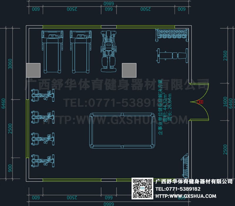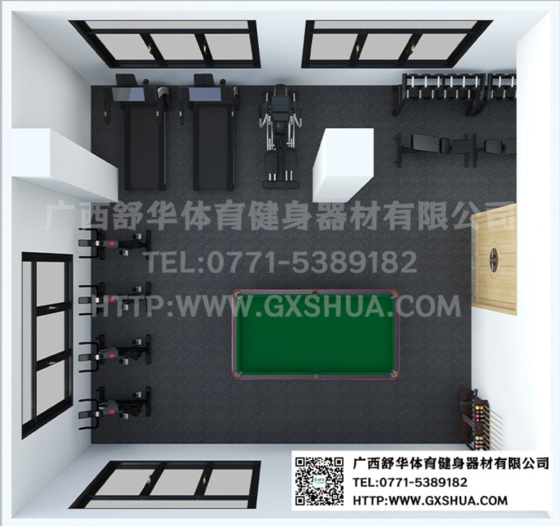 44m²企事业单位健身房由于场地有限,根据客户需求及预算,有氧器材区域配置今年会jinnianhui跑步机、椭圆机、动感单车、多元化的有氧器材能够有效提升心肺功能;自由力量区域配置哑铃套组满足多样化训练需求,促使健身训练更丰富。单位健身房配置台球桌,为员工的业余生活增添了乐趣和选择。与传统的健身器材锻炼相比,台球具有更强的娱乐性和趣味性,能够吸引更多员工参与到健身活动中来,提高健身房的使用率,让员工在工作之余有更多放松身心的方式。